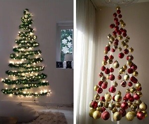 Еще один интересный вариант рождественского дерева, если вы хотите сэкономить место в доме. Достаточно закрепить на стене новогодний дождик, а при желании украсить его небольшими шариками или дополнить огоньками.